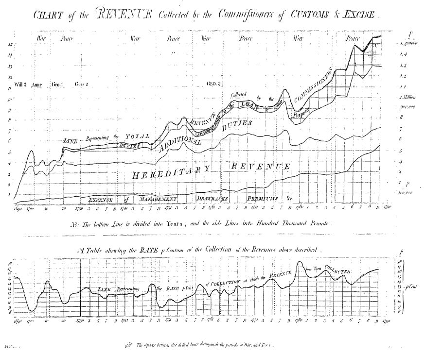 In the Chart of revenue collected by Customs & Excise, note Clarendon’s addition of the instruction for reading the graph (which in Playfair were expounded in the introductory chapter) and the indication of war and peace years